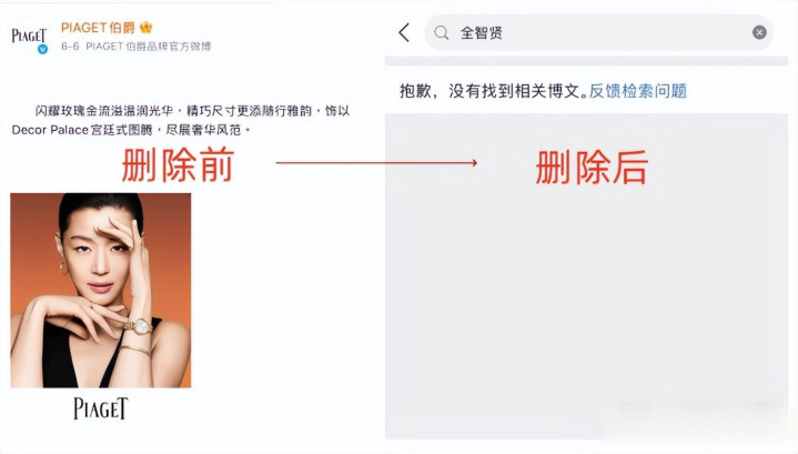 不断地网友们在评论区不断地施加压力,和消费者不断冲击下,最先爱她的伯爵高级奢饰品撤回了全智贤的照片,并且关于一切的代言和广告全都删除了,目前关于她的广告一点都没有。