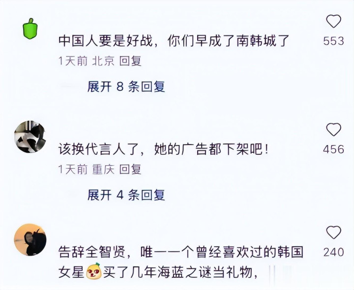 网友们在网络上纷纷表示“吃中国饭砸中国碗”,全智贤怎么也没想到一夜之间“形象全毁”“口碑一夜崩塌”,三个奢饰品代言纷纷采制她。