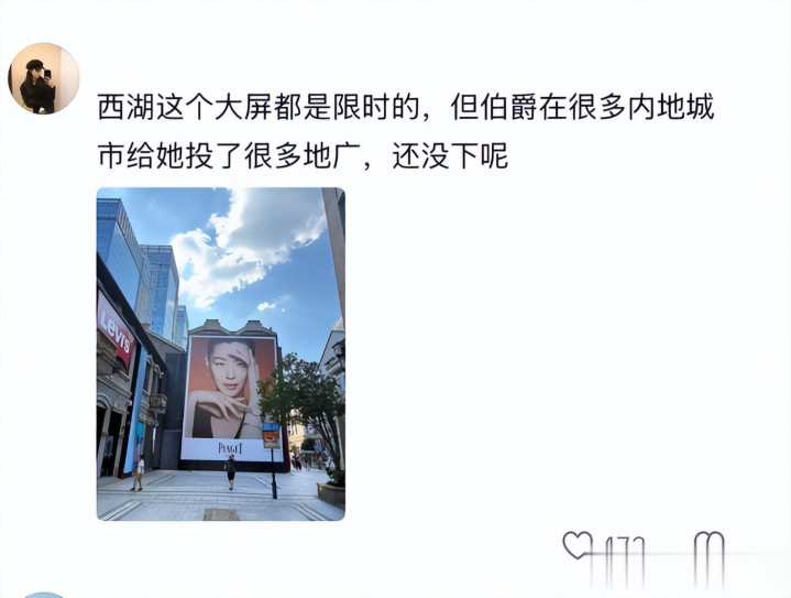 高级奢饰品伯爵刚刚宣布她为“全球品牌大使”,还将全智贤的海报放在开屏广告里,甚至独有的海报放到C位,更在核心商圈里放最主导的位置。