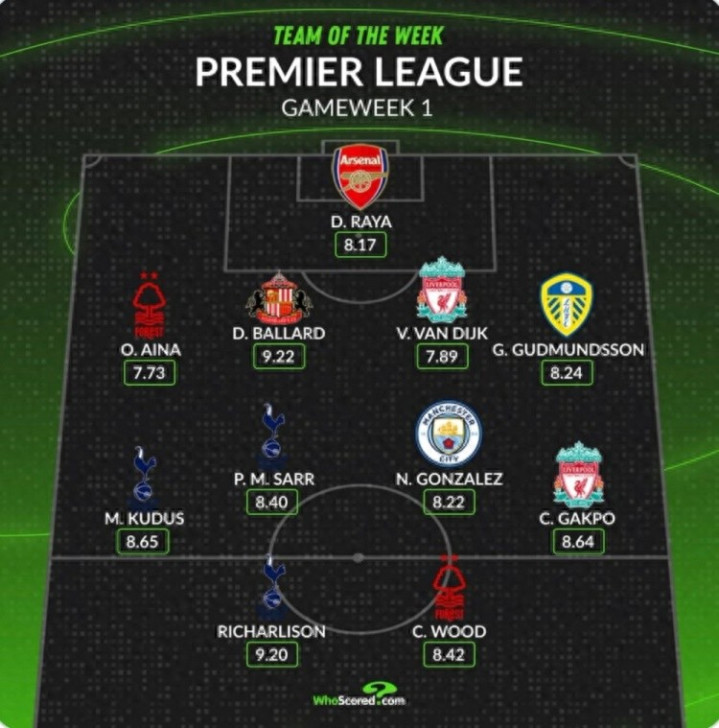 Whoscored评英超首轮最佳阵: 拉亚、加克波、理查利森在列