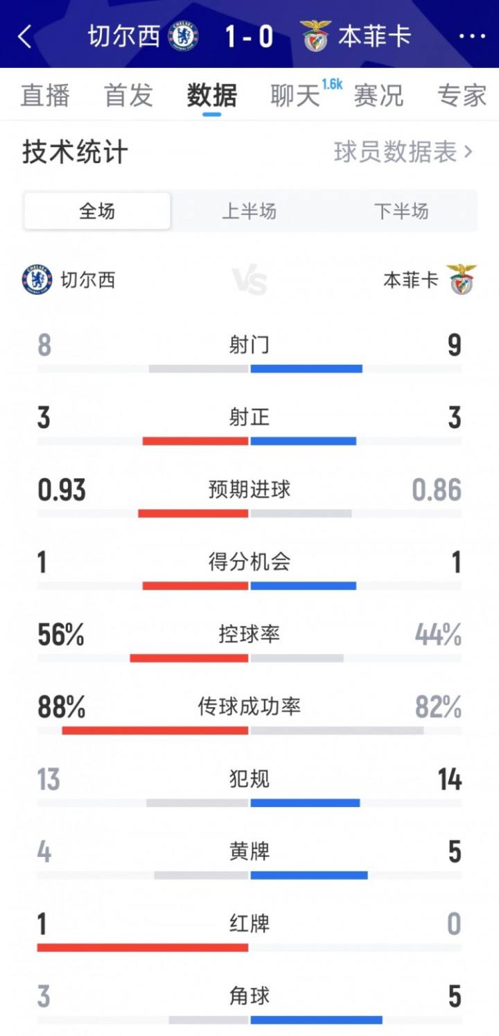 切尔西1-0本菲卡全场数据: 射正8-9, 射正3-3, 黄牌4-5, 红牌1-0