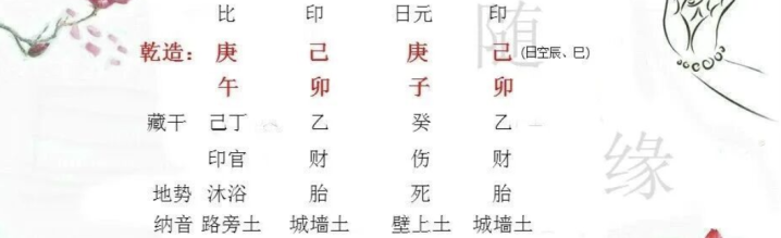 八字乾造:你生于庚午年、己卯月、庚子日、己卯时(日空:辰、巳);1岁起运:庚辰;路旁土命人,每十年逢芒种之后转运,现在走在31至41岁的癸未大运中。