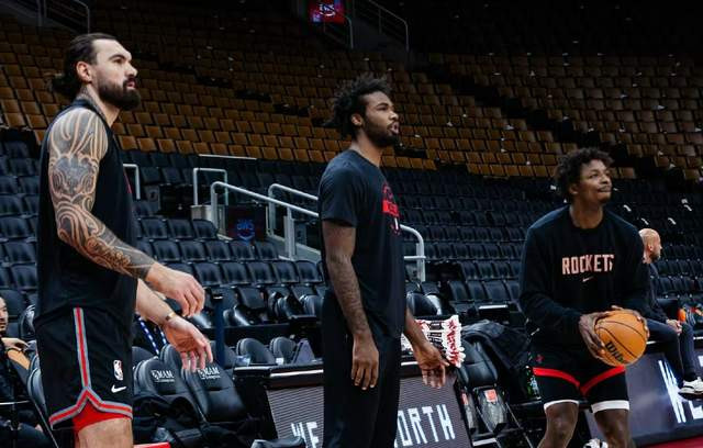 由于谢泼德状态不稳定,投不进三分,在场上毫无作用,火箭队只能让阿门汤普森长时间的控球、组织,去做自己不擅长的事。上个赛季,火箭队后卫线有范弗利特,阿门只需要空切、下快攻完成终结,防守端无处不在,从一号位能够补到五号位。今年则是大有不同,打控球后卫控运不过关,失误成为了家常便饭,将他的短板无限放大放大,第三节后半段,他的多次处理不合理,被猛龙打成10-0,