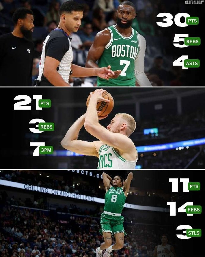 杰伦-布朗今天表现很不错,打了32分钟,20投12中,三分9中4,罚球2中2,砍下全场最高的30分外加5篮板4助攻1抢断1盖帽,正负值+20。赛季前5场比赛,独自带队的布朗场均出战32.4分钟,可以得到26.8分5.6篮板3.8助攻,投篮命中率52.2%,三分球命中率46.9%。