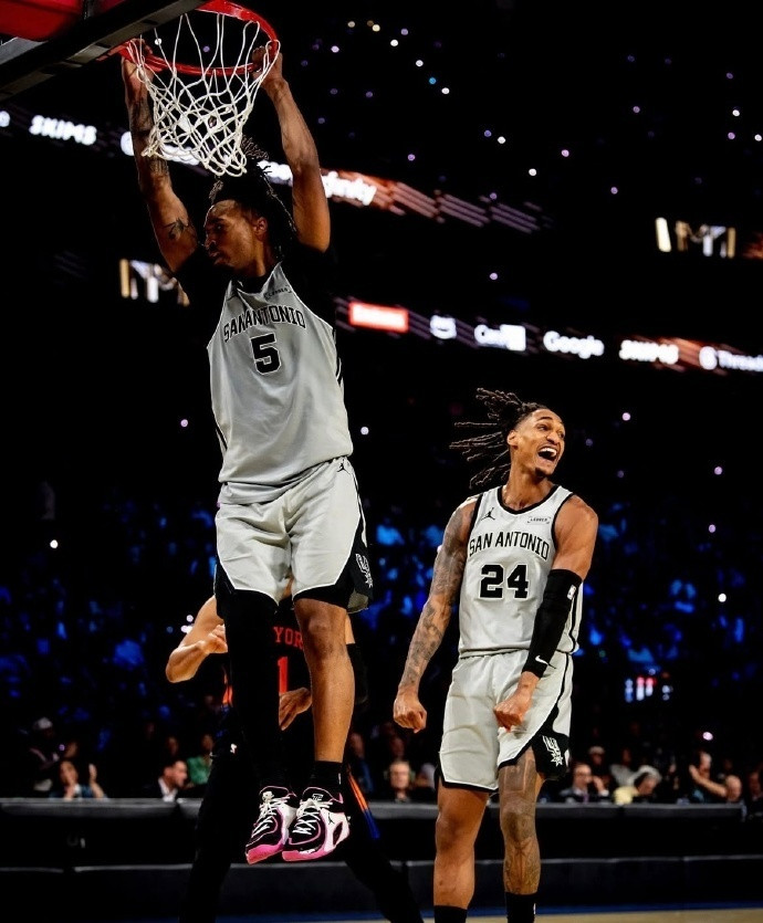 马刺今天多点开花,和尼克斯一样,一共有多达7人得分上双,但却只有一人得分20+。上一场才迎来复出的文班亚马今天继续替补出战,表现不佳,替补出场25分钟,投篮17中7,三分球6中2,罚球4中2,拿到18分6篮板2盖帽的数据,正负值-18。榜眼秀哈珀表现不俗,出战28分钟,14投7中,其中三分球7投5中,罚球2投2中,得到21分7篮板,正负值-15。