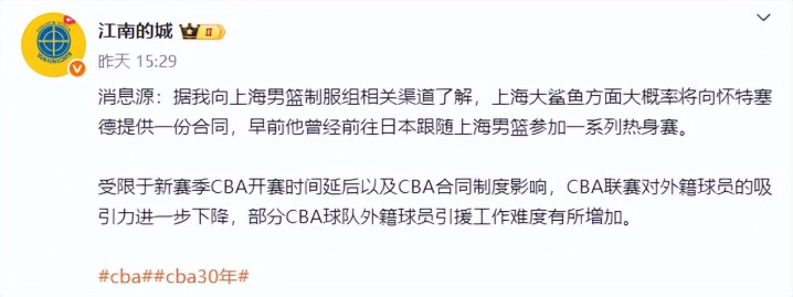 根据多个方面的消息来看,上海男篮已经签下了四名外援,分别是大外援洛夫顿,小外援古德温、泰勒-哈维和弗格。这让不少上海球迷比较担心,认为只签一名大外援的话,内线的隐患还是比较大的。据媒体人“江南的城”透露,上海男篮管理层对此也有些担心,有意为之前在球队试训的大外援怀特塞德提供一份合同。